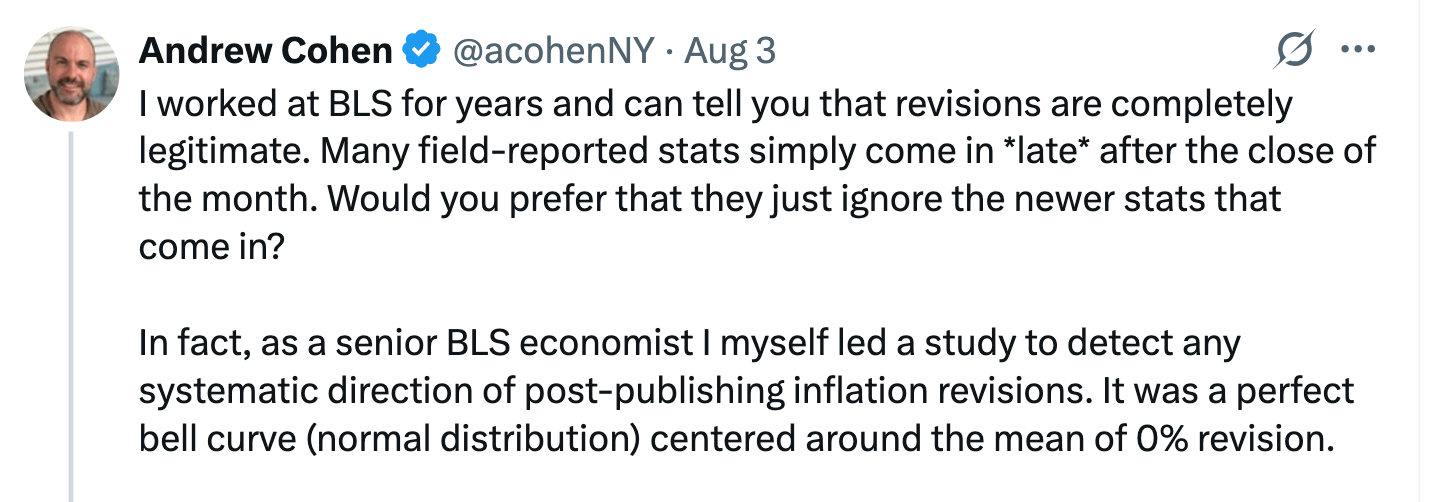 The problem is his ‘simply come in late’ numbers are just made up. They are sourced from ordinary people running businesses and doing their best. 50% of whom are likely just putting down “whatever’ on the form because they have to get home and make dinner. Directionally, the overall picture is likely correct. The scale of change is likely indicatively correct but that’s as good as it gets.