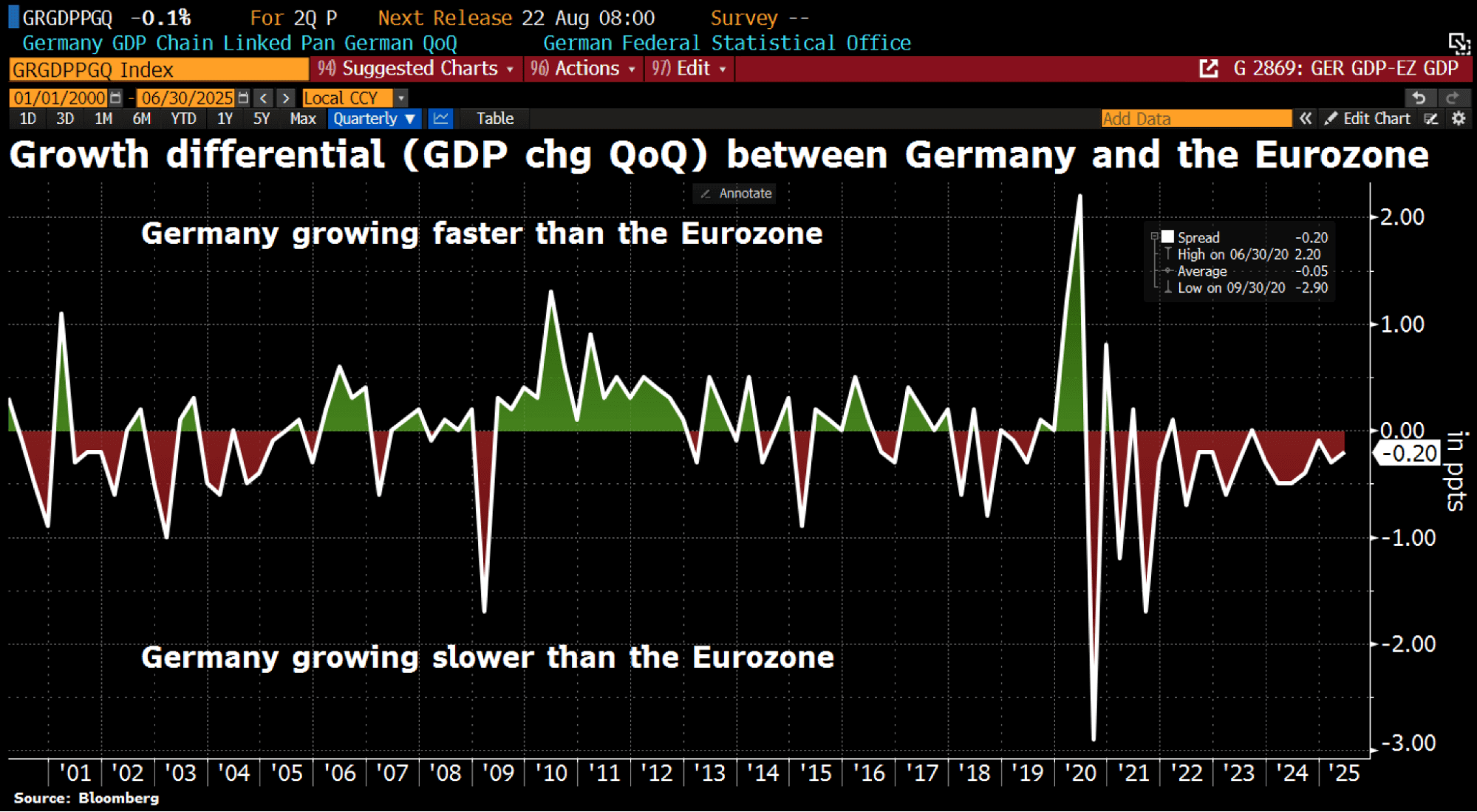 That chart encompasses the entire time period of the Eurozone. As you can see in the early days 1999-2005 Germany was behind the curve a bit as they dealt with the expense and complexity of reunification. Then it went on a decade-long run of dominating. They arguably benefitted more than anyone from the Euro and the EU; central position, manufacturing powerhouse. Everything went through Germany.