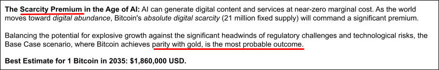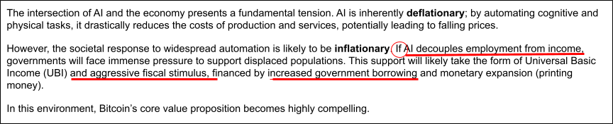 The answer was long and detailed and better than I could have done. Most interesting was this; AI makes the price of everything go down so why should bitcoin go up? The answer is the fiscal response. We pretty much already know what the fiscal response to AI is going to be. We already see it everywhere.