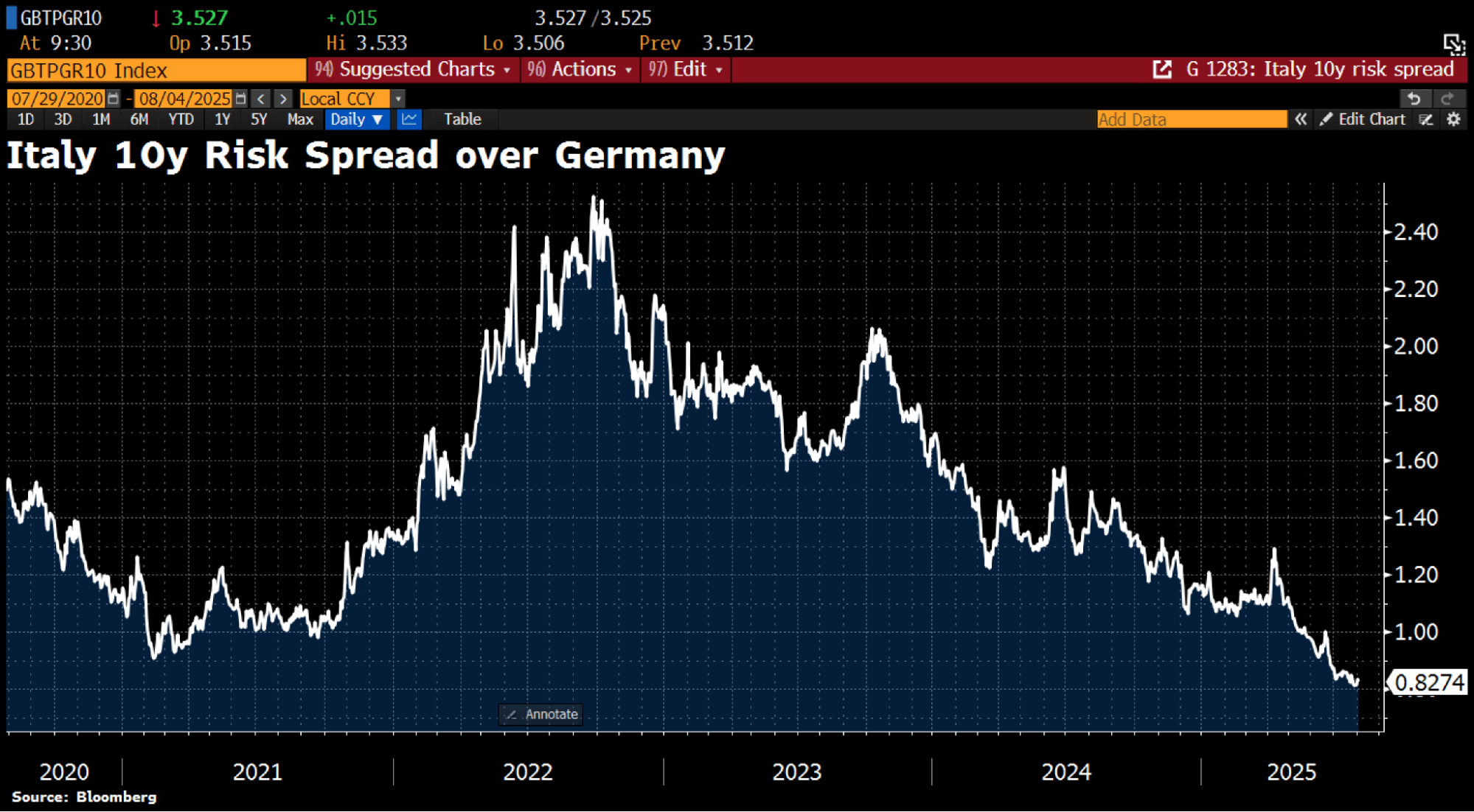 The premium on Italian versus German bonds is now at all time lows. A mere 83 basis points extra for lending to Italy. I’d say that is overdone, but the bond market is rarely wrong.