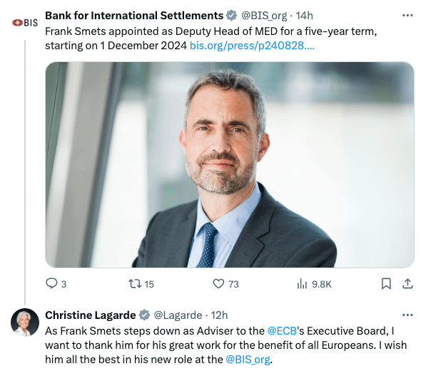 Three weeks off for Christine, well deserved too. Her first act of the Autumn season was to lament the departure of Mr Frank Smets. A man none of us has ever heard of. Frank, it turns out, was an economic adviser to the ECB Board.