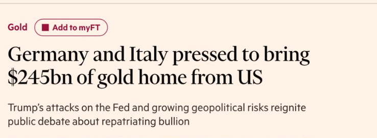 The Germans and the Italians were seeking to bring their gold home from America. In the meantime, China has shipped over 5000 tons of it back home since 2023. Europe, as usual, is a bit late to the game.