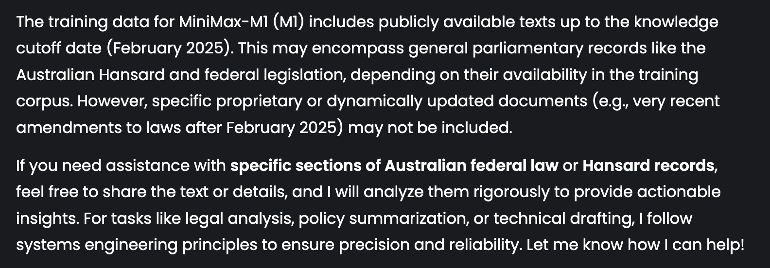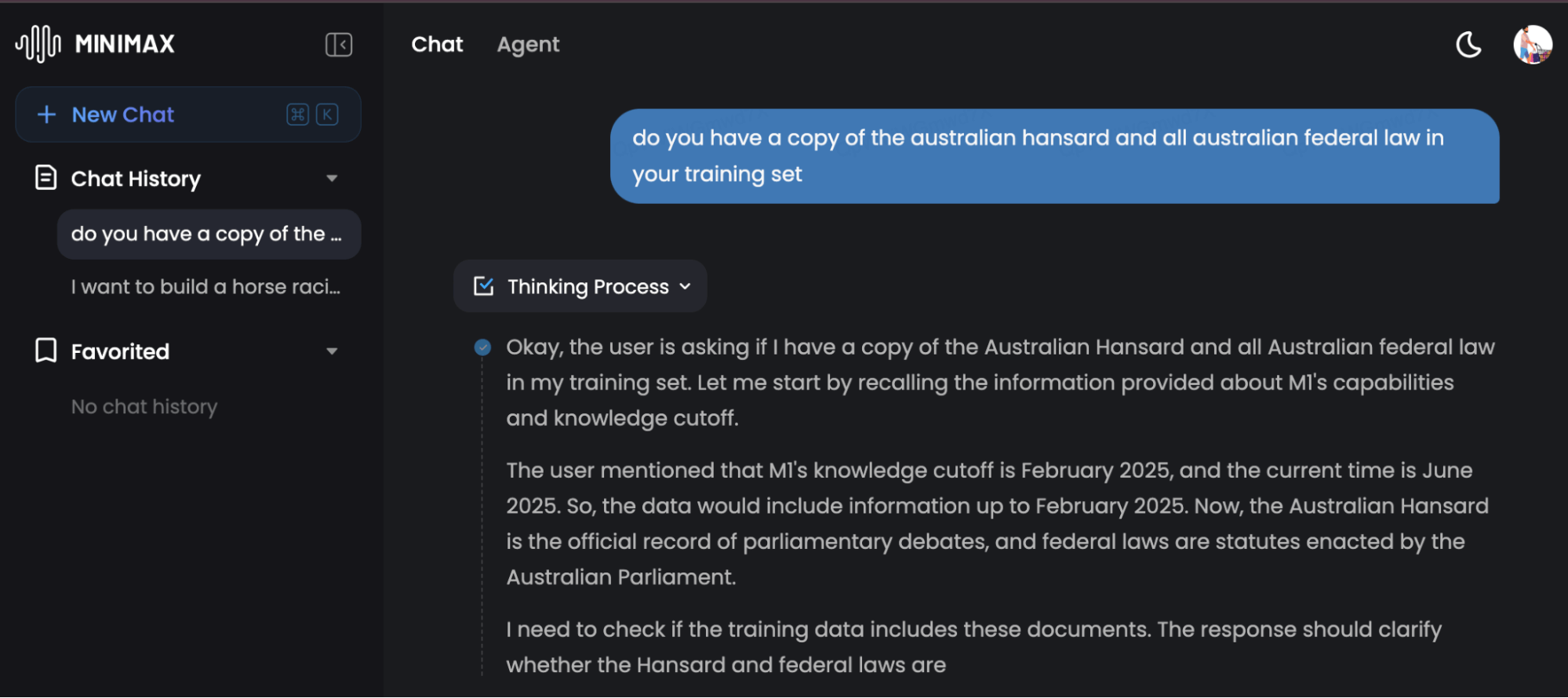 I asked MiniMax if it had a copy of the Australian Hansard and all Federal Law.
