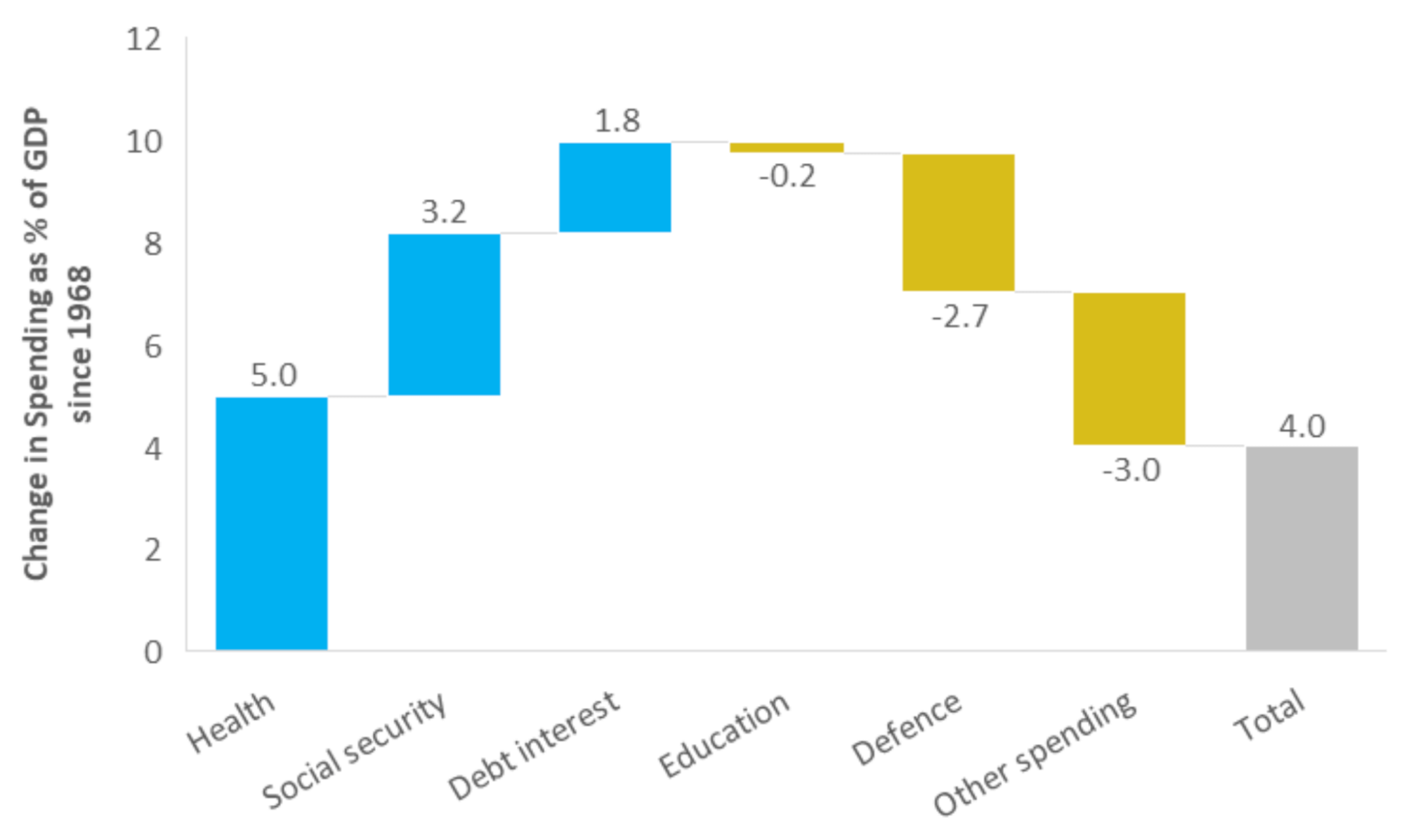 The extent of the commitment is not trivial. In Britain the change in spending patterns has always been to cut defence in order to supplement health and social security. Overall spending is up by 4% of GDP since 1968. How can Britain get to 5% of defense without cutting something else?