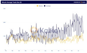 Nice chart here from Kaiko. You can immediately see the impact of the ETF on bitcoin trade sizes. Since Coinbase is conducting most of them they have seen a near doubling in size while Binance has remained flat.