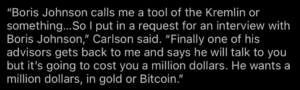 So it is with Boris Johnson, who when invited for an interview with Tucker Carlson to discuss Ukraine, allegedly replied, “I will, but I want $1 million in gold or bitcoin.”