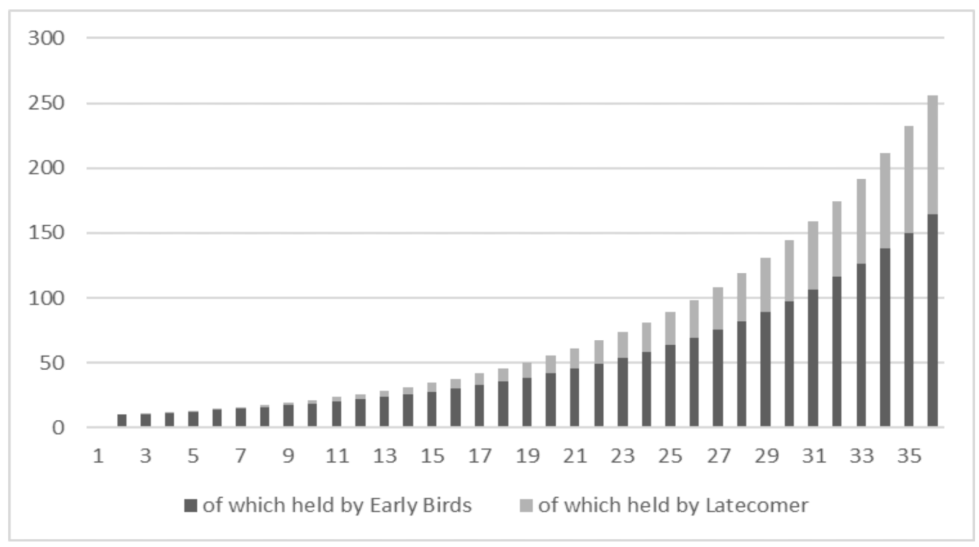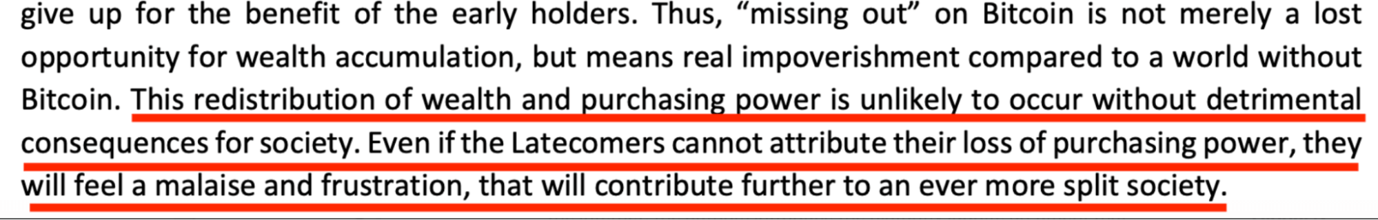 To illustrate their point, they include a chart which indicates the extent to which early adopters will dominate the bitcoin wealth curve, roughly ⅔ to the early adopter group. Is this not true of any successful investment though? In fact it is normally far more extreme.