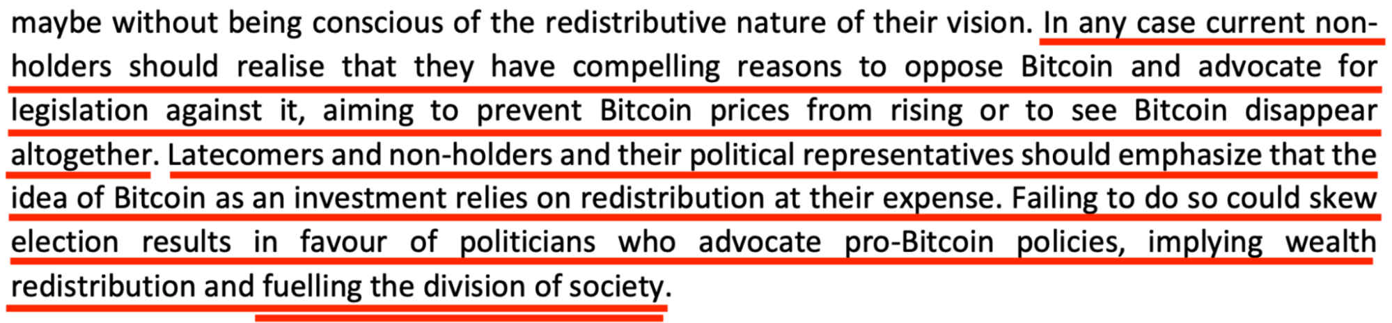 They advocate here for “non-holders” to oppose bitcoin because it represents a direct transfer of wealth from them to the earlier adopter. As far as the Euro is concerned, this is true but it is only true because the Euro is corrupt. The better argument would be that bitcoin has features people find attractive, like a fixed supply. Perhaps take those features to prevent governments monetising other people’s wealth. In effect, make the Euro better, and actually compete with the enemy.