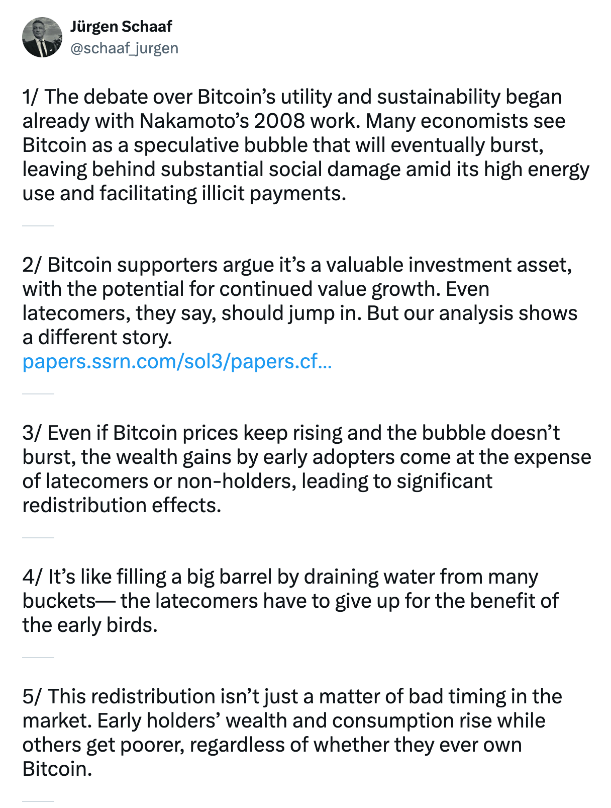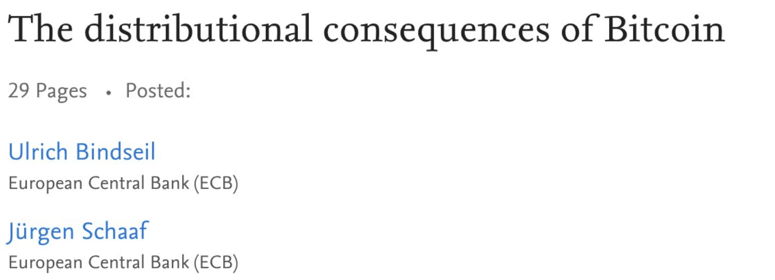 So we enter a new phase. The strategy among global central banks of insisting ‘bitcoin is a bubble that will fail’ has not worked. The ECB website is littered with attack articles going back decades. What is new this time is the basis of the argument. Author, Ulrich Bindseil is a long serving Director General of the ECB, so the paper cannot be dismissed as the musings of some back of house PhD student. They have taken some reputational risk here.