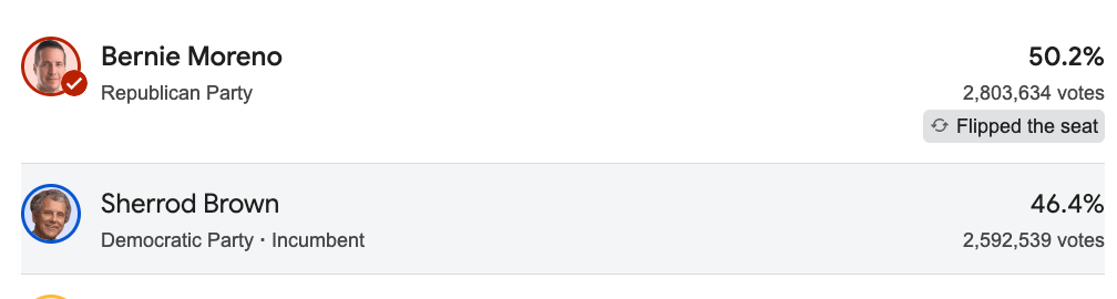 Less well publicised has been the defeat of Ohio Senator Sherrod Brown. The 71 year old has held the seat since 2007 and was defeated on Tuesday by Bernie Moreno.