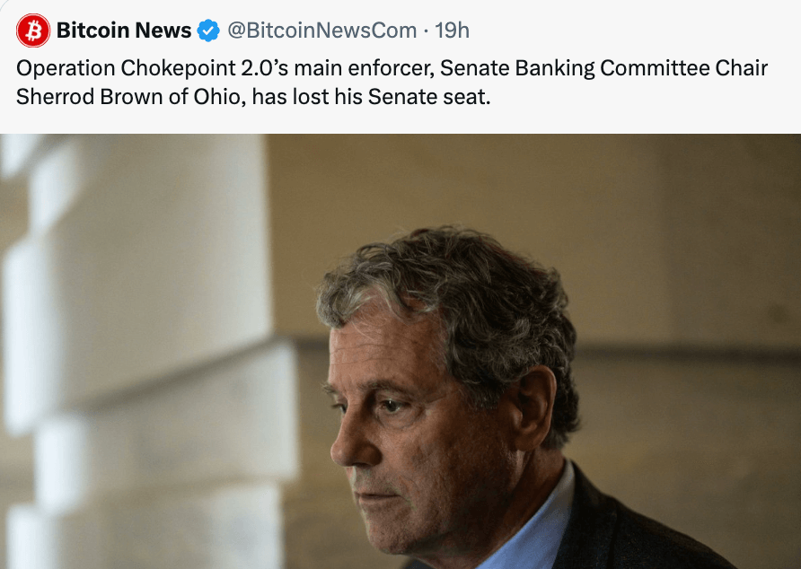 It might seem trivial, but Mr Brown was the Chairman of the Senate Banking Committee and was a key figure in Operation Chokepoint 2. Chokepoint weaponized the banking sector against the crypto-industry by denying access to banking platforms. The goal was to destroy bitcoin in America. It initially worked and successfully took out the perfectly solvent Silvergate bank. A good business was needlessly destroyed.