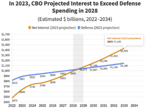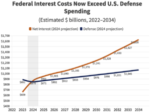 With $34 trillion in debt (ignoring all state debt, unfunded pensions, etc.) just the raw figure interest payments now exceed defence spending and rising, more than any other line item.