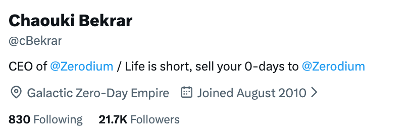It also documents the business of Chaouki Bekrar, a French national who sells access to anyone in the world’s iPhone or Android phone for upwards of $1 million dollars. His business still exists, website here zerodium.com. His Twitter account is still live, one assumes because he is useful to governments as well to others, perhaps less well intentioned. Naturally, he can also be found on LinkedIn.
