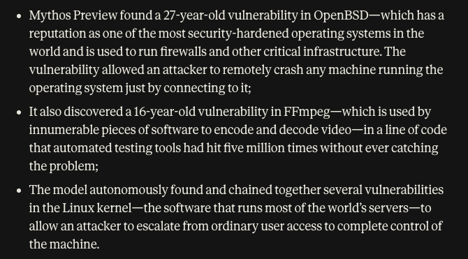 Accordingly, Anthropic has announced “Project Glasswing”. They have released the model to Apple, Linux, NVIDIA and others so they can patch the vulnerabilities before the model is released more generally to the public. It found a 27 year old zero day in one of the best open source firewall programs.