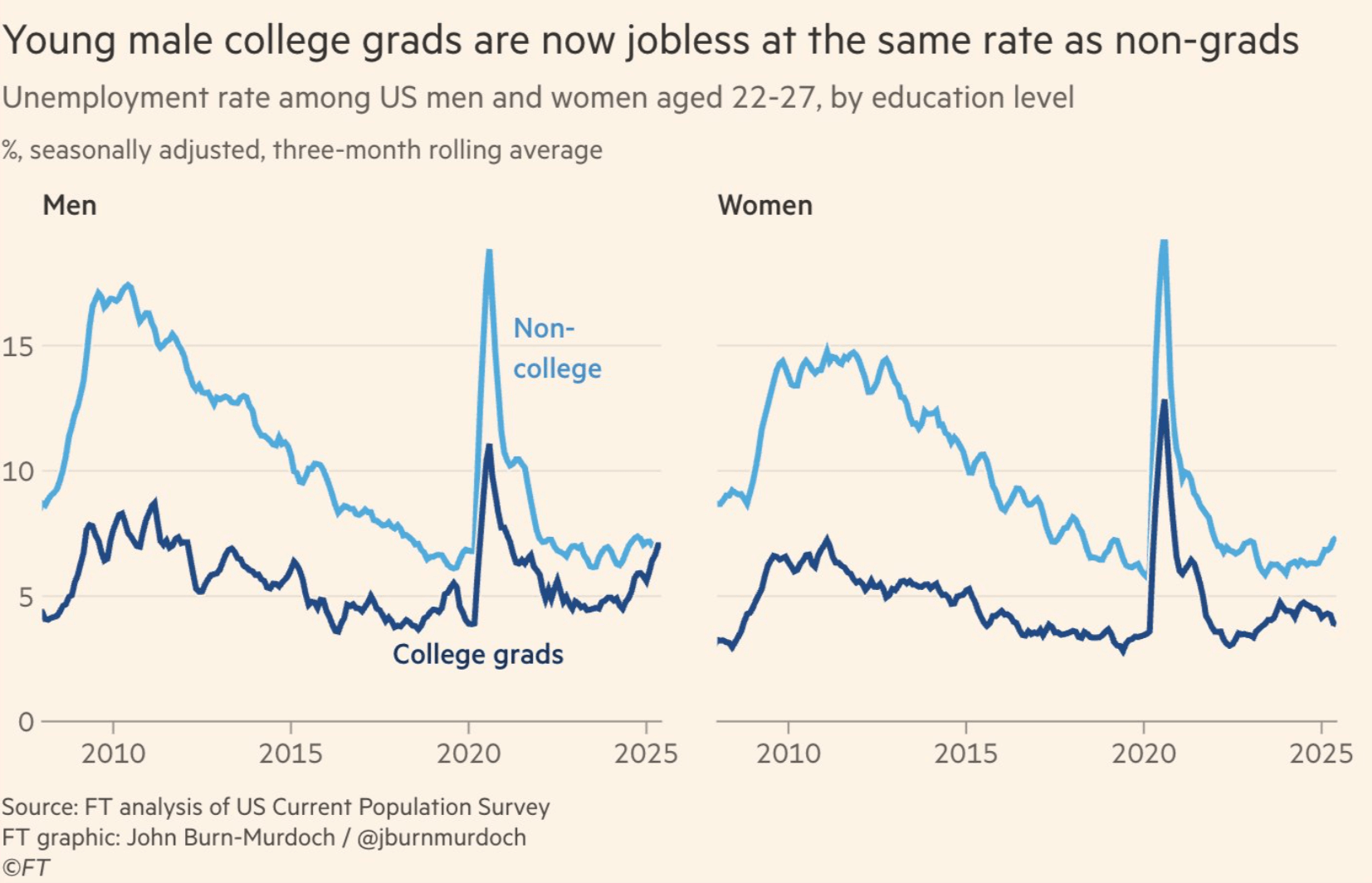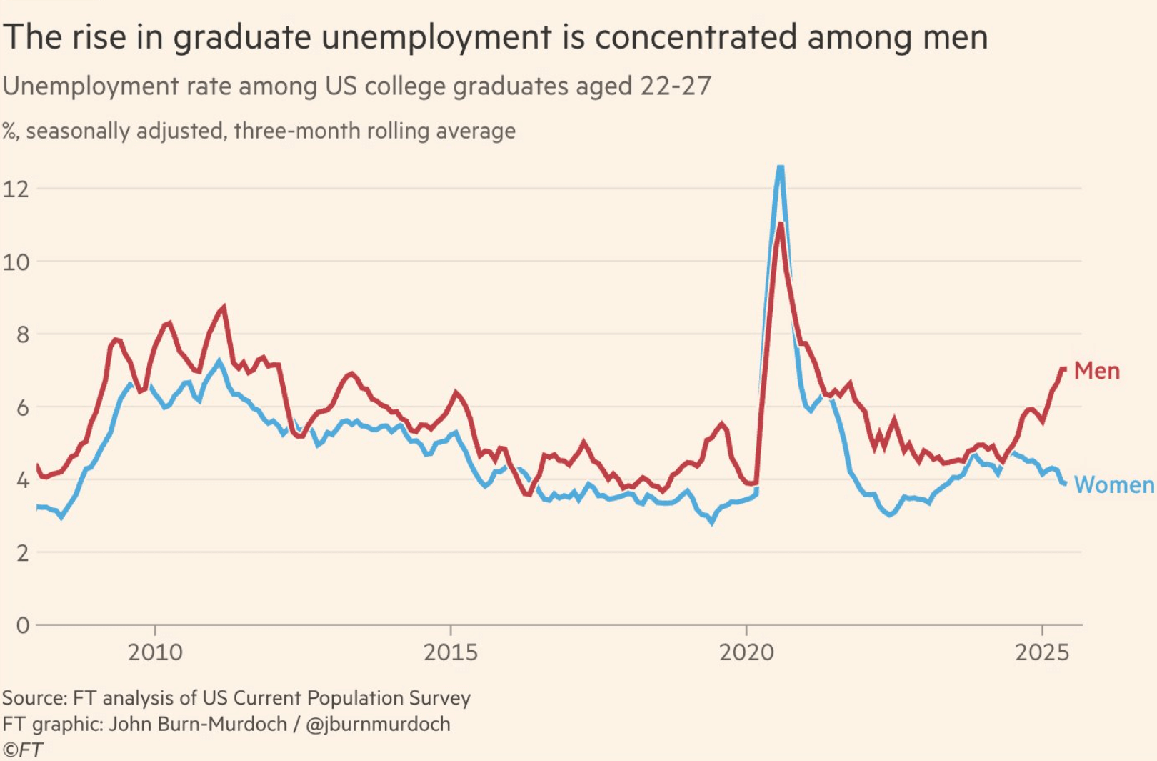 I remain convinced that the entire conversation is missing the point. Interest rate cuts mean nothing when wages are collapsing. In the US, this trend is becoming even clearer among recent graduates. For men in particular, the unemployment rate has spiked this year because so many of the roles they would have taken are now able to be done by artificial intelligence. Entry-level IT jobs are pretty easy for most AI’s and they are materially better at doing them.
