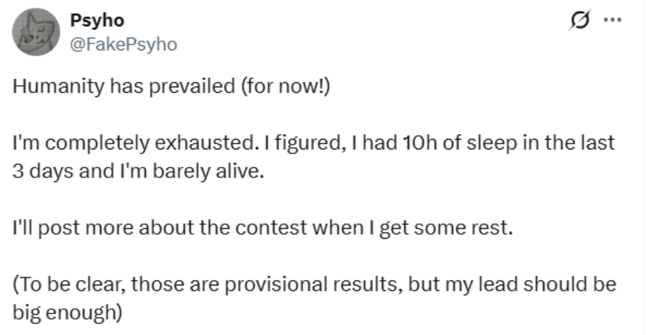‘Psyho’ is an elite programmer. He used to work for OpenAI and went up against their internal programming model in a coding competition. An enormous effort over a gruelling three days, his conclusion following his win was as follows: