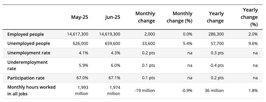 Not great stats for June with a sharp rise in unemployment in Australia. Now at 4.3%. As usual, there was a tidal wave of commentary about how this would precipitate a rate cut from the RBA in August. They stand accused of ‘policy errors’, as though a 25 basis point cut this month would have made any difference.