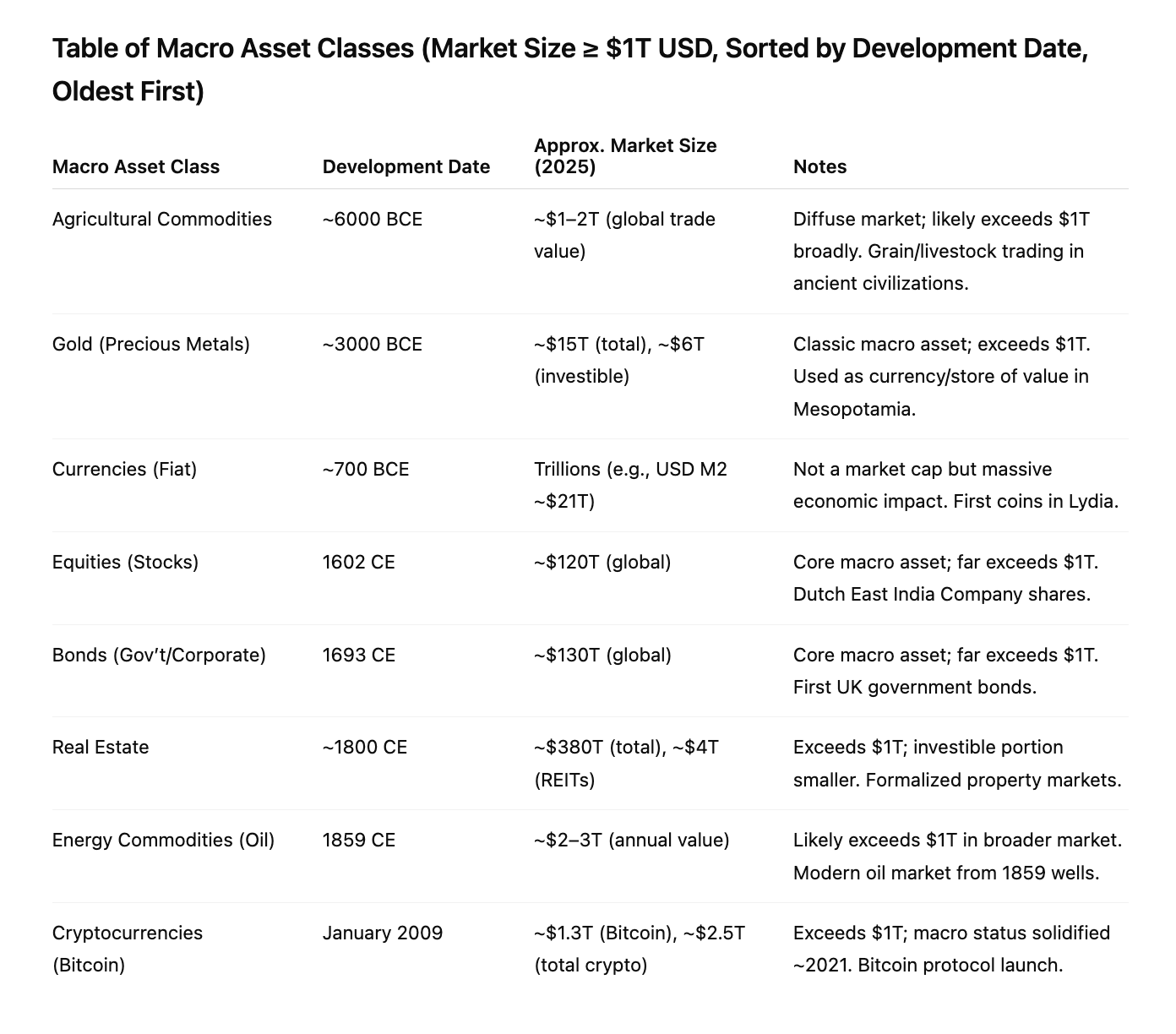 Assume you didn’t know much. You know roughly what asset classes exist but you don’t know much about them. What you do know is that new asset classes are very rare. The pace of their emergence is rising from the thousands of years to the hundreds of years but they still don’t come along often.