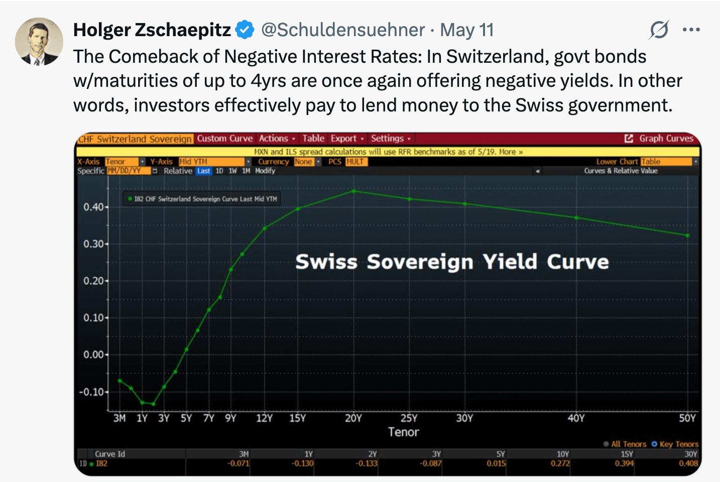 In addition, there will be pressure on the long end due to a lack of supply. Switzerland runs a tight ship ~ 37% debt to GDP and an almost balanced budget. There just aren’t that many long bonds. Pension funds love them though for liability matching. Their 20 year old members are probably unknowingly buying 40 year bonds and getting an annual 0.3% for life, which doesn’t sound that good.
