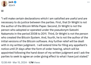 A huge win for everyone involved in bitcoin, in particular the bitcoin developers, who even with Dorsey’s backing, could not have enjoyed the last few years that much. The written judgement will eviscerate Wright.