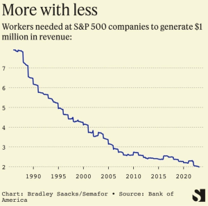 How is that possible? With software. In companies that rely on software they can write code that can pretty much do any task and with AI writing it is increasingly easy and fast. Google and Facebook (and much less so Apple) are almost entirely software driven businesses. It is not beyond the realms of possibility that both companies, with planning, could tell their staff to take a month off and everything would simply carry on as it is now, generating millions per hour.