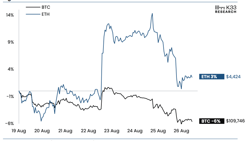 Significant rotation to ETH from BTC recently. The ETH ETFs are gaining some traction and would clearly be benefitting from the Genius Act. We would expect some stable coin issuance to take place on that platform.