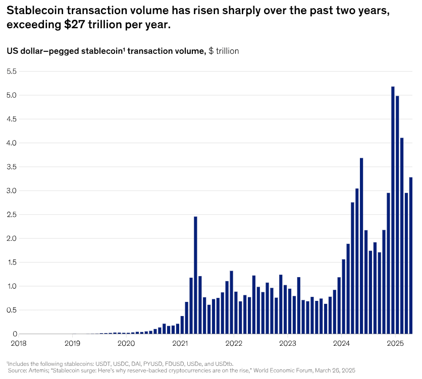 The stablecoin roll out is important. We need to see them embedded in the global financial infrastructure in the next few years. Total volume is already in excess of $27 trillion which is roughly equivalent to the total value of global trade in goods and services. Can you run an economy on stablecoins? Well from a total value exchange perspective the answer seems to be yes.