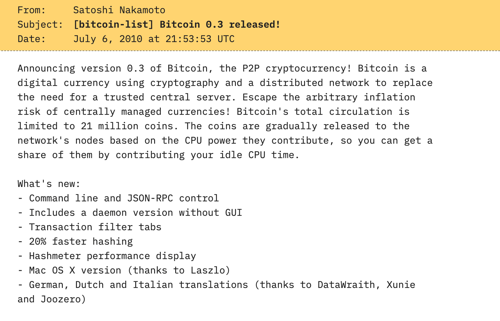 Finally, a brilliant treasure trove for you to explore which contains all the correspondence of Satoshi Nakamoto. This one announces an early version of the software. It includes thanks to Laszlo for ‘the Max OSX version’. The same guy who spent 10,000 Bitcoin on a pizza.