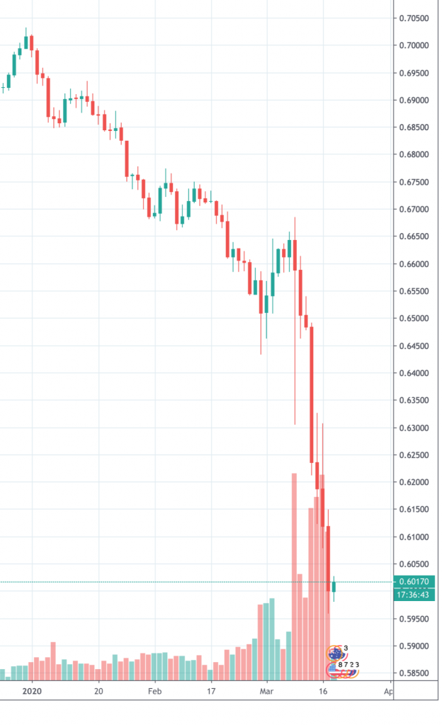 Here we see the USD against the Australian dollar, this year alone. This is the third largest currency trading pair in the world. A 15% fall in three months 10% of which came in 5 days. Simply, that is the rush to US Dollars.