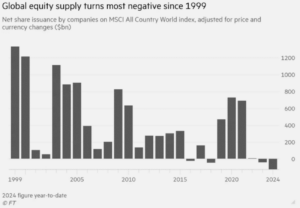 Global equity supply has turned negative. The FT explained this phenomenon as “uncertainty weighs on new issuances and companies continue to buy back large volumes of stocks.”