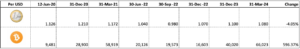 Since the quarter has ticked over we should update ourselves on Euro v Bitcoin. Coming up for the four year anniversary of doing this and we are currently sitting on a 6x increase. Not all quarters included below just showing some of the highs (March 21) and lows (Dec 22) along the way. It’s worth noting that when the chips were really down in December 2022 (FTX and Luna had collapsed), we were still 1.5x the Euro in performance terms. At that time Lagarde ran around telling everyone how volatile bitcoin is.