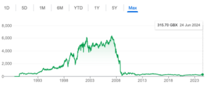 They went bankrupt in 2008; my personal view is that they remain technically bankrupt today but they were bailed out by the government and have limped along ever since. At the end of June 2009, post their bail out the share price was £4.10, today it is £3.15. Remarkably, they still rank 24th in the UK’s FTSE 100.