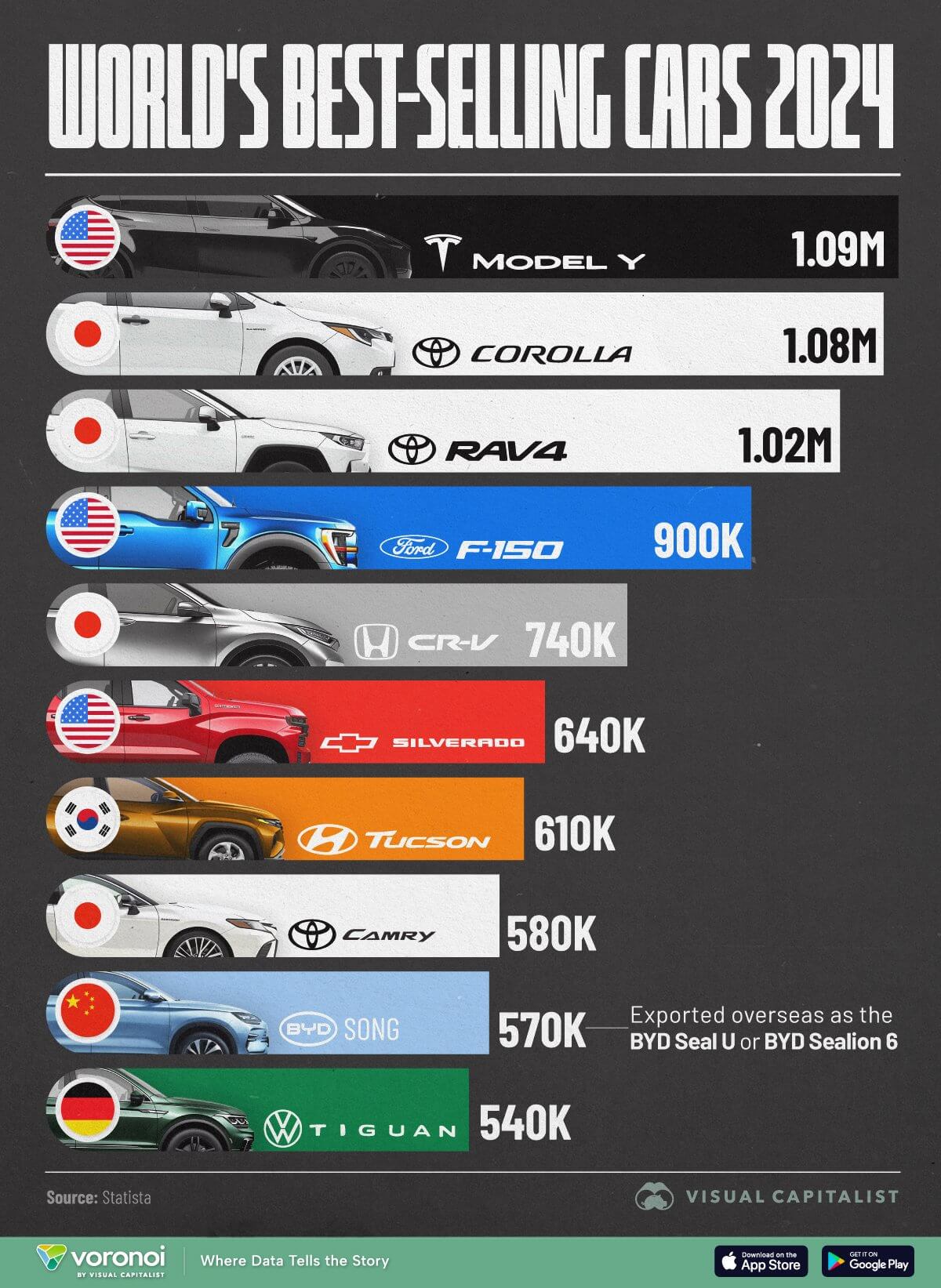 Why agree to it then? Well, Europe has no leverage, they have nothing to sell. They rely nearly entirely on the US for their defence while pretending that they don’t. They prefer to moralise and regulate than innovate to solve the real problems of the world. Look at the top 10 selling cars globally in 2024, I would have guessed at least 3-5 European cars, a BMW, a few VWs, maybe a Mercedes somewhere?……Nope. VW Tiguan ranks tenth; all other models are Asian or American.