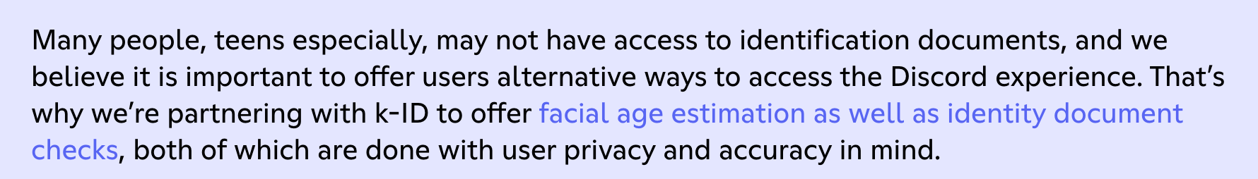 The United Kingdom’s online safety act went into force this week. It requires online service providers to filter content so that it is ‘teen appropriate’. Happily, even though none of them have ID the new facial age estimate technology will be there to help.