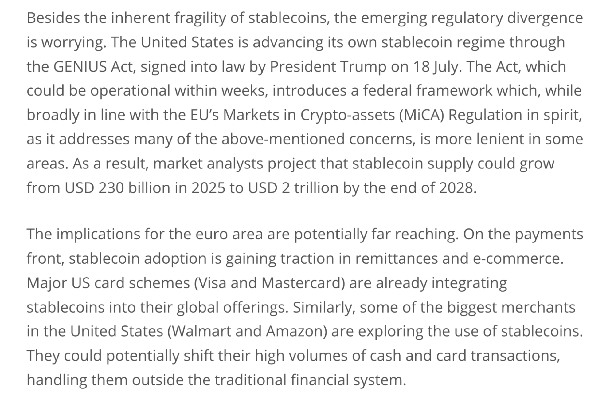 “Stablecoins are reshaping global finance – with the US dollar at the helm. Without a strategic response, European monetary sovereignty and financial stability could erode. However, in this disruption there is also an opportunity for the euro to emerge stronger.”