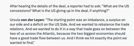 – The EU now gets charged 15% tariffs on its exports to the US when they commit to charging zero tariffs on US imports in the EU