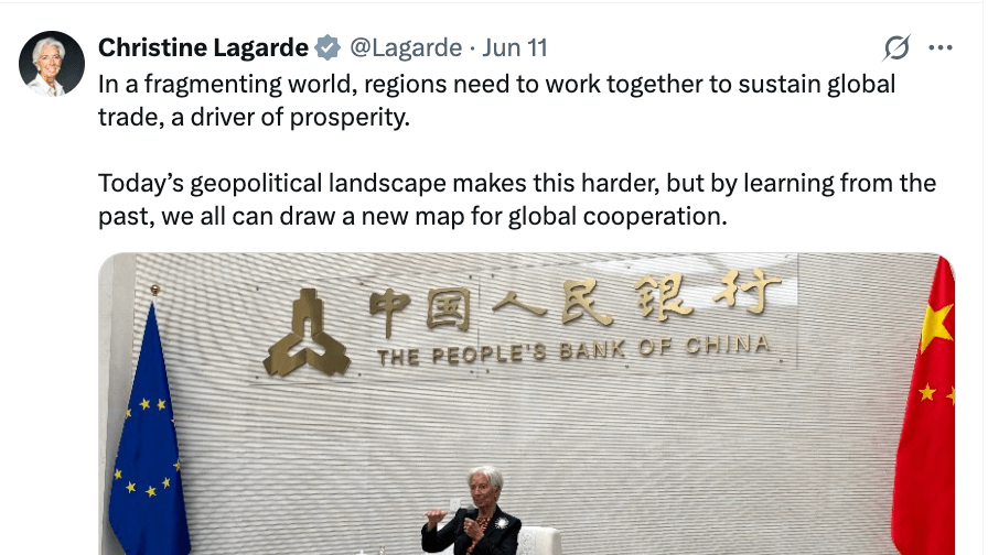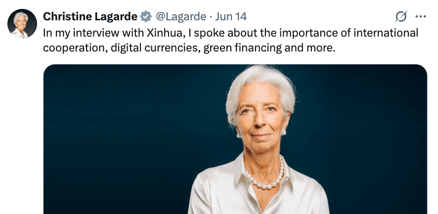‘I spoke about the importance of “digital currencies and green financing”’? You met the head of the PBOC and the Chinese Premier Li Qiang and you didn’t mention either of those things. You gave a speech to the PBOC and did not mention them at all. Not green-anything because you know it’s a joke and not the role of the Central Bank. It is a joke that has destroyed the European (particularly German) economy and made Europe relatively poorer. Everyone in China knows it’s a joke too, so why embarrass yourself by mentioning such a terribly failed policy.