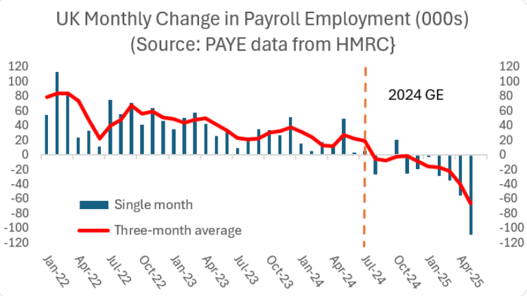 These stats from the UK are normally a good leading indicator. “Money numbers” from the Inland Revenue about what has been paid in payroll tax. Overall it’s a very sharp drop in employment and trending sharply down. One of the major causes has been an increase in what is known as Employers National Insurance. The recent increase was big enough (13.8% – 15%) but the level of earnings to which it applied dropped from £9,100 to £5,000 per year. Effectively capturing most casual workers across the UK economy.