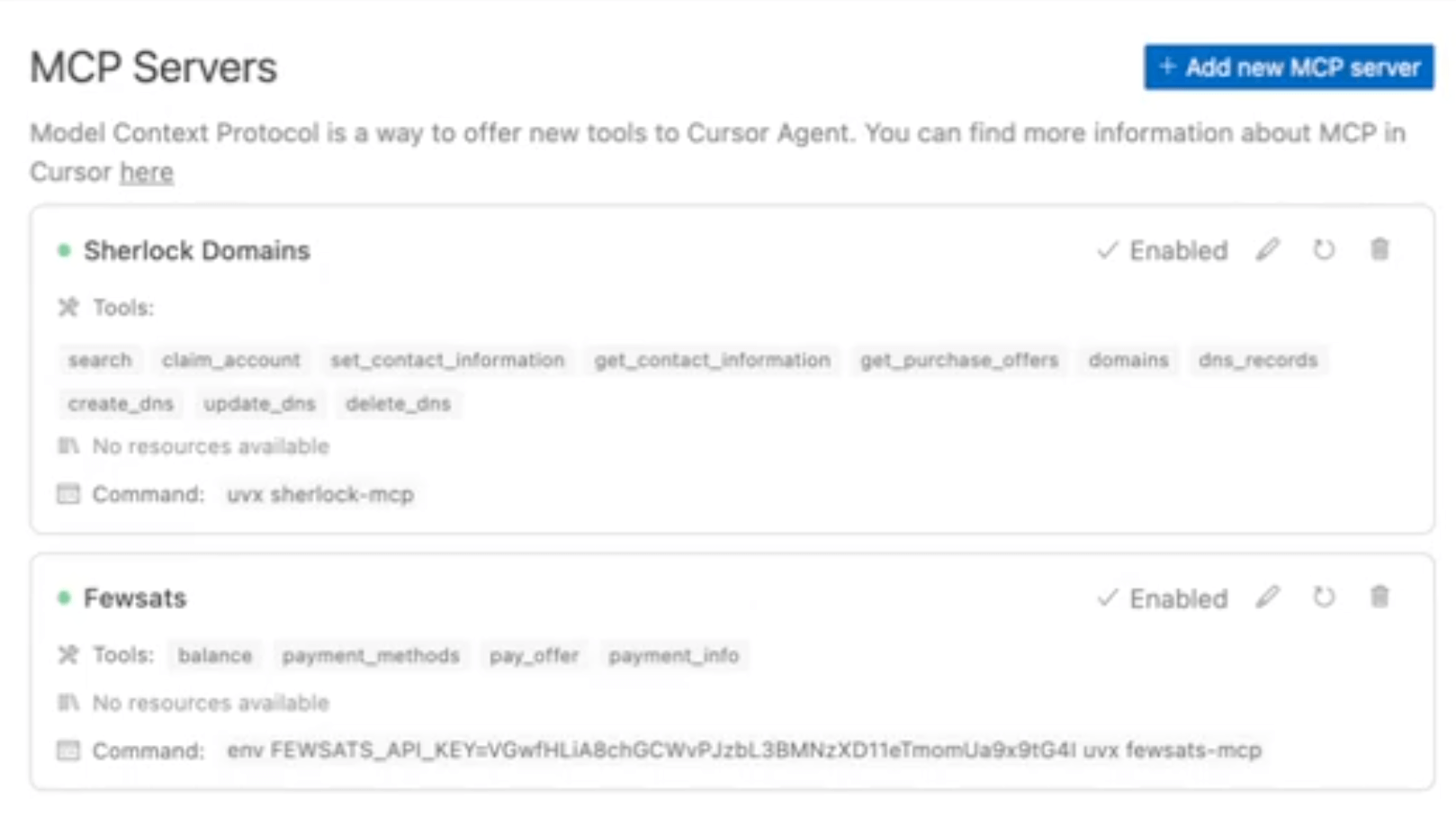 In the example below, two new MCP servers are deployed. One called sherlockdomains. It is the first ever domain name search tool for AI agents, it lets your AI go and search for specific domains for your project and returns suggestions to you. Quite fun to play with.