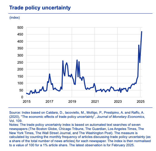 Now it’s the same again, Europe is struggling because of “Trade Policy uncertainty”. Indeed the graph is remarkable. Look how steeply it rises everyone! In fact it is based on an automated search of The Guardian, The LA Times, NY Time, WSJ and Washington Post. It counts the number of times those publications discuss trade. The more they do so the more the graph rises.