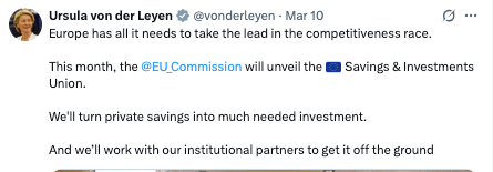 “We’ll turn private savings into much needed investments.” There is of course lots to unpack in these statements. First of all, private savings would tend to imply that the money belongs to the private citizens of Europe. Presumably they have made an assessment of risk and decided that saving the money is a superior option to deploying it. Those reasons might be that investments in Europe tend to be in 18th century windmill technology which citizens are declining to support with their own capital.
