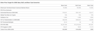 Our own range for ETH is anywhere from zero to $20,000 by 2030, which is much narrower than that of VanEck but accepts the possibility that it could completely fall into a heap. I think we should probably be open about that even if only so that it encourages people to do their own research. We published a report on Ethereum some years ago, which I think has relevance still today.