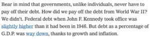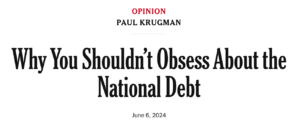 Confident in his position, he deployed his latest article, “Why you shouldn’t obsess about the national debt”. Interestingly, it is not behind the New York Times paywall (I am instantly suspicious of non-paywalled articles when the NYT has spent millions of dollars blocking all its other content to non-subscribers). I guess because it’s an election year and it would be rather helpful, given its political slant, if people would read it.