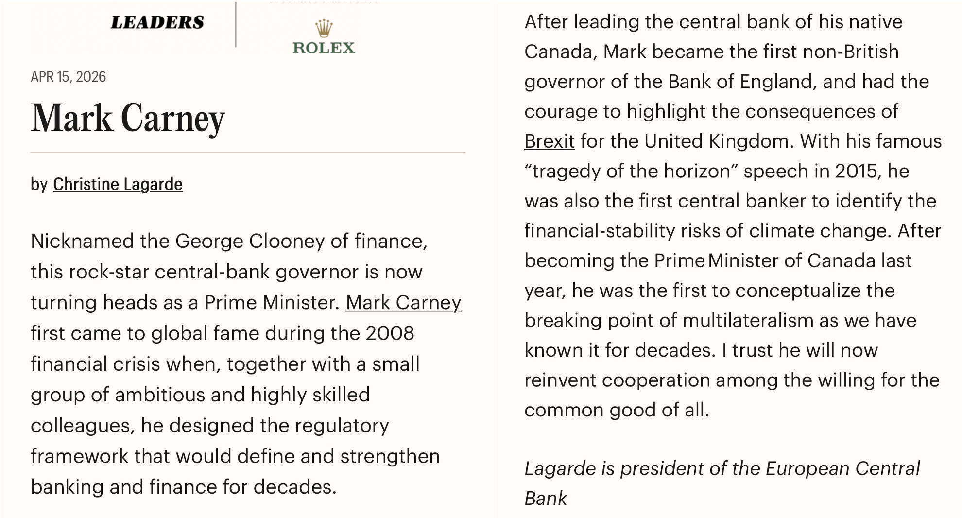 I believe Mark Carney to be wrong about almost everything. He’s a zealot who does not understand the wealth creation mechanism, he left Britain in a terrible state. He could have done better. He will do the same to Canada. But it doesn’t matter because he is attractive and charming and people do like being around him and basking in that charm. Consequently, important people like Christine Lagarde are willing to prostitute their own reputations to cement his friendship.