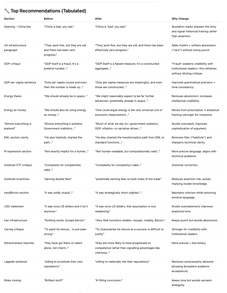 The rest though are mostly equivocations. It does not want to take a position, simply to soften everything, not offend. The comments are from GPT 5.4. GPT 4.5 had far more of a personality and was a much better writer. The latest models are like HR staff, spending hours not offending and ‘crafting the message’ to the point that nobody wants to hear it.
