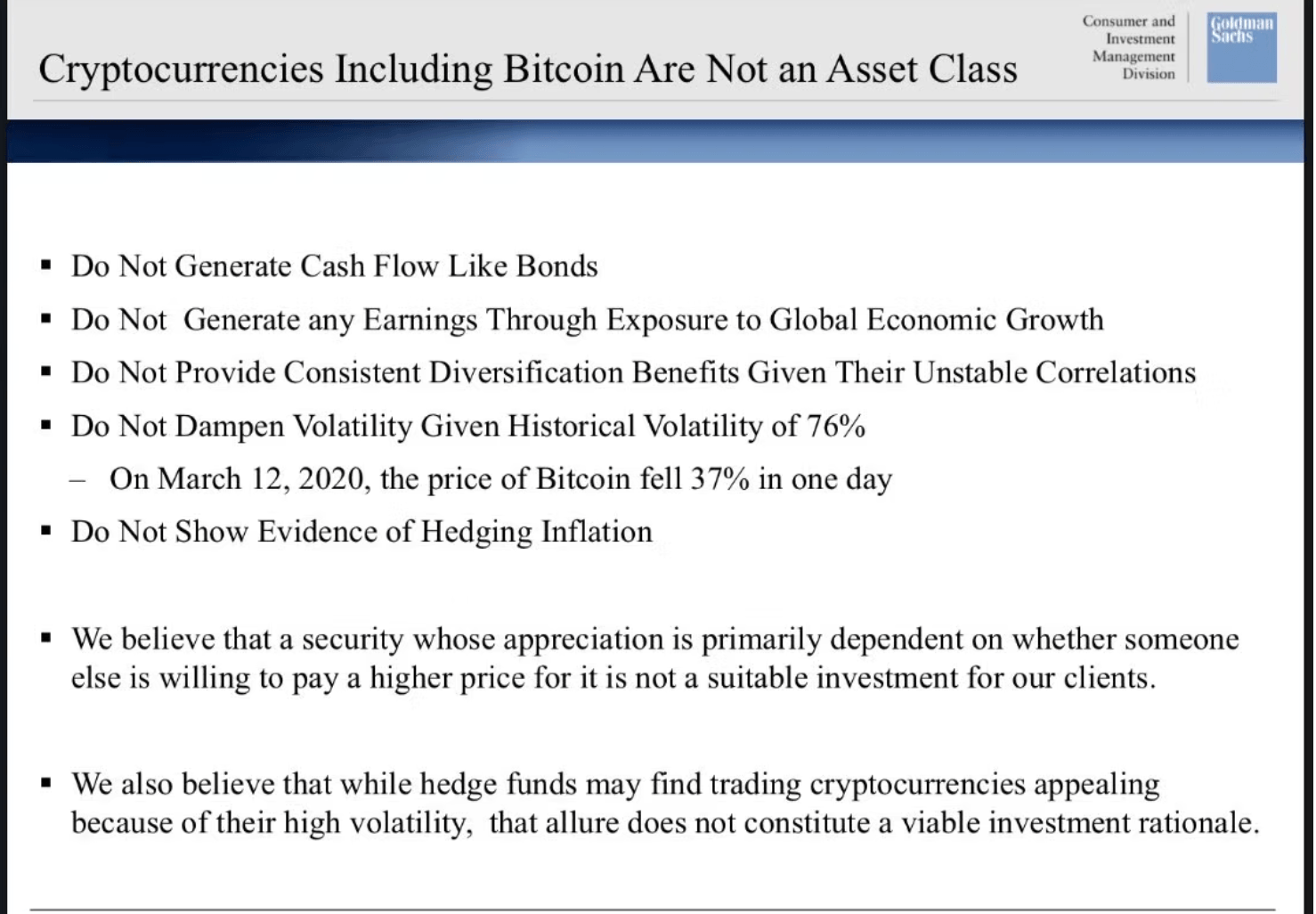 Anyway, here are the Goldman slides from 2020 (that leaked) in which they told clients Bitcoin wasn’t an asset class, couldn’t generate income and wasn’t investable.