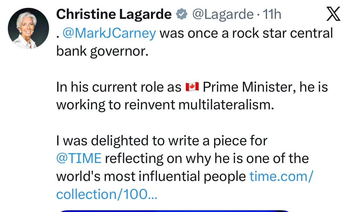 It’s been a while since we heard directly from Christine. She was back this week talking up one of her old buddies Mark Carney. He has been nominated as one of the top 100 most influential people in the world by Time Magazine.