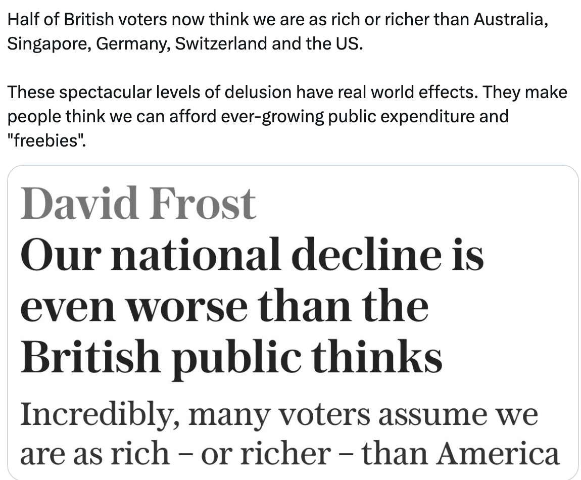 Government statistics, GDP, inflation, all stories. You can see it in how many Brits believe their country is richer than Australia or the US. They believe the story.